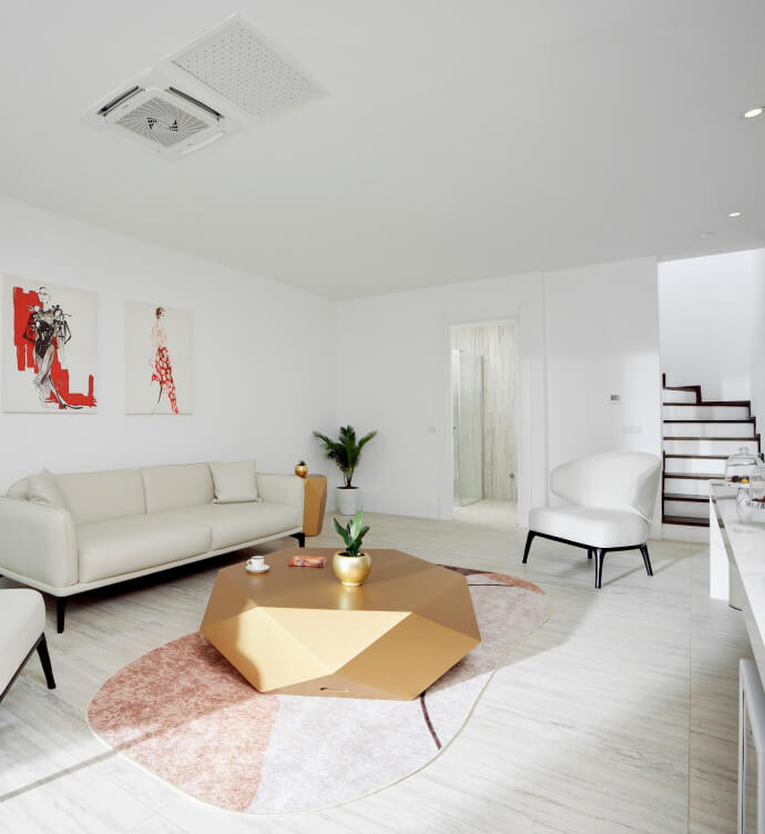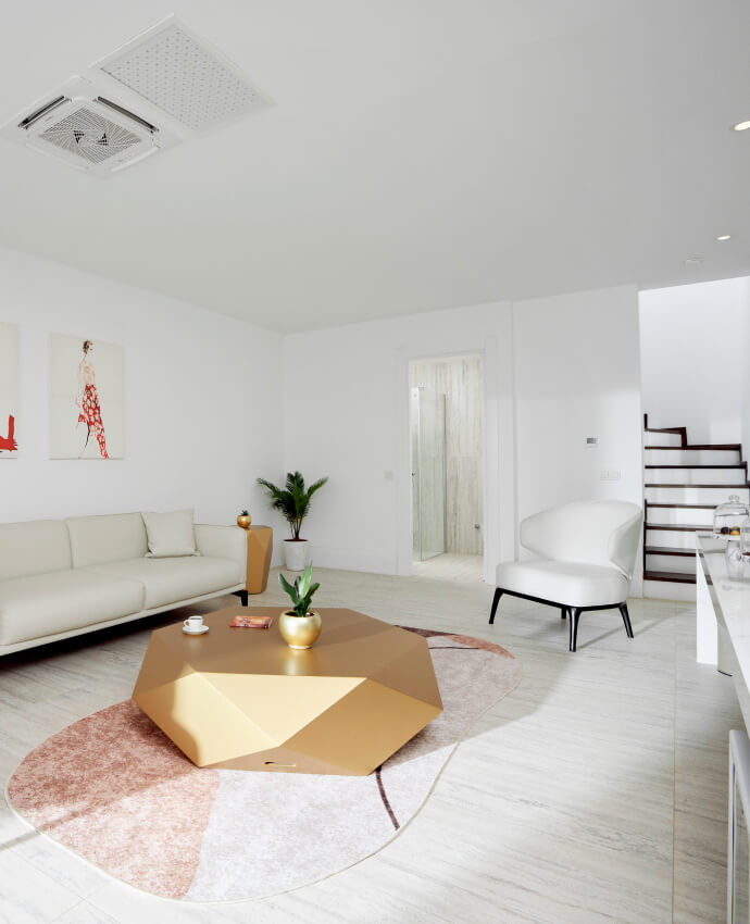 İki kat arasındaki geçiş, odanın ferah atmosferini daha da vurguluyor.