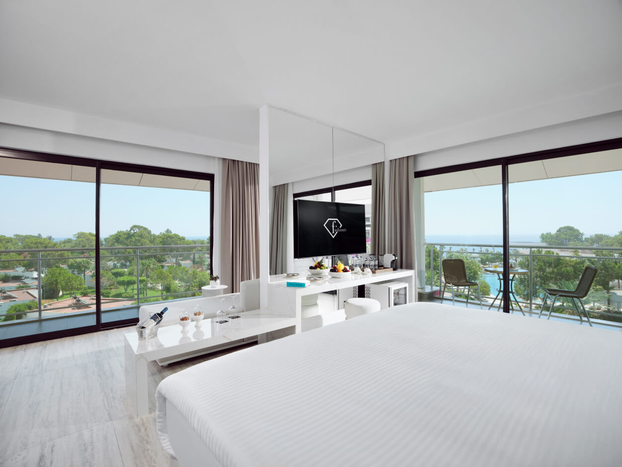 Executive Suite, 105 m² genişliğindeki alanı ve deniz manzarasıyla, size her açıdan ferahlık ve rahatlık sunuyor. İki yatak odası ve bir oturma odası ile hem aileniz hem de arkadaşlarınız için geniş bir yaşam alanı yaratıldı. Odamızın her bir detayında, modern tasarımın şıklığı ve işlevselliği ön planda.